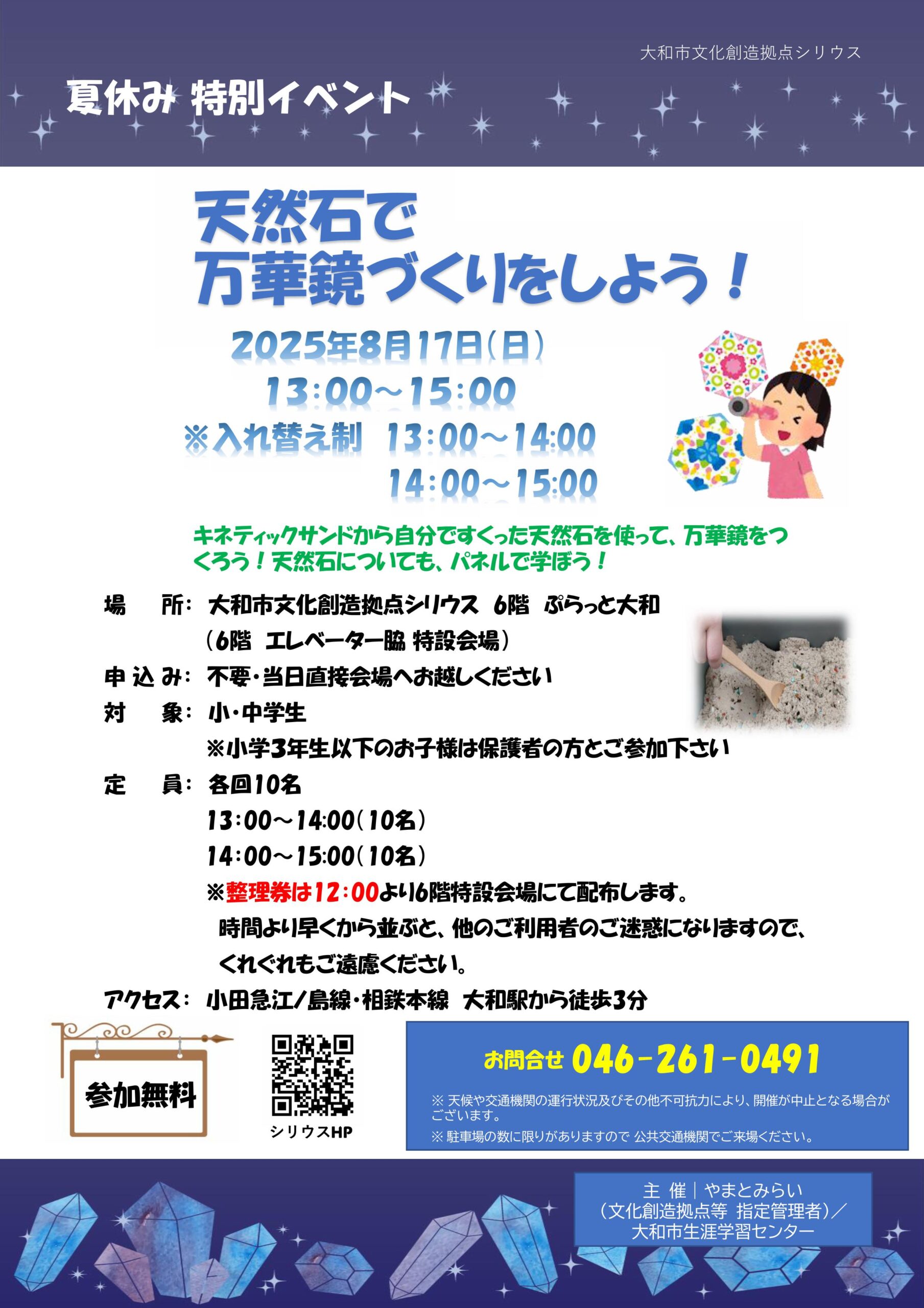 YAMATOMIRAI > 文化創造拠点シリウス > イベント情報 > 夏休み特別イベント 天然石で 万華鏡づくりをしよう!