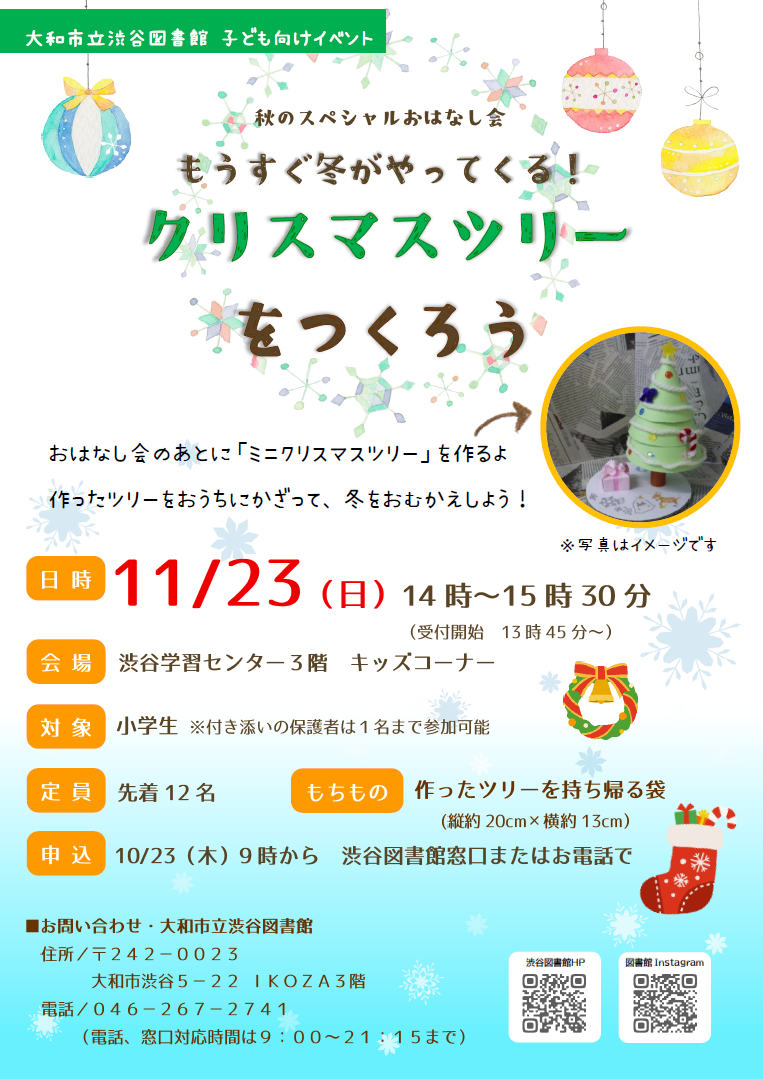 YAMATOMIRAI > 渋谷図書館 > イベント情報 > 秋のスペシャルおはなし会 もうすぐ冬がやってくる!クリスマスツリーをつくろう