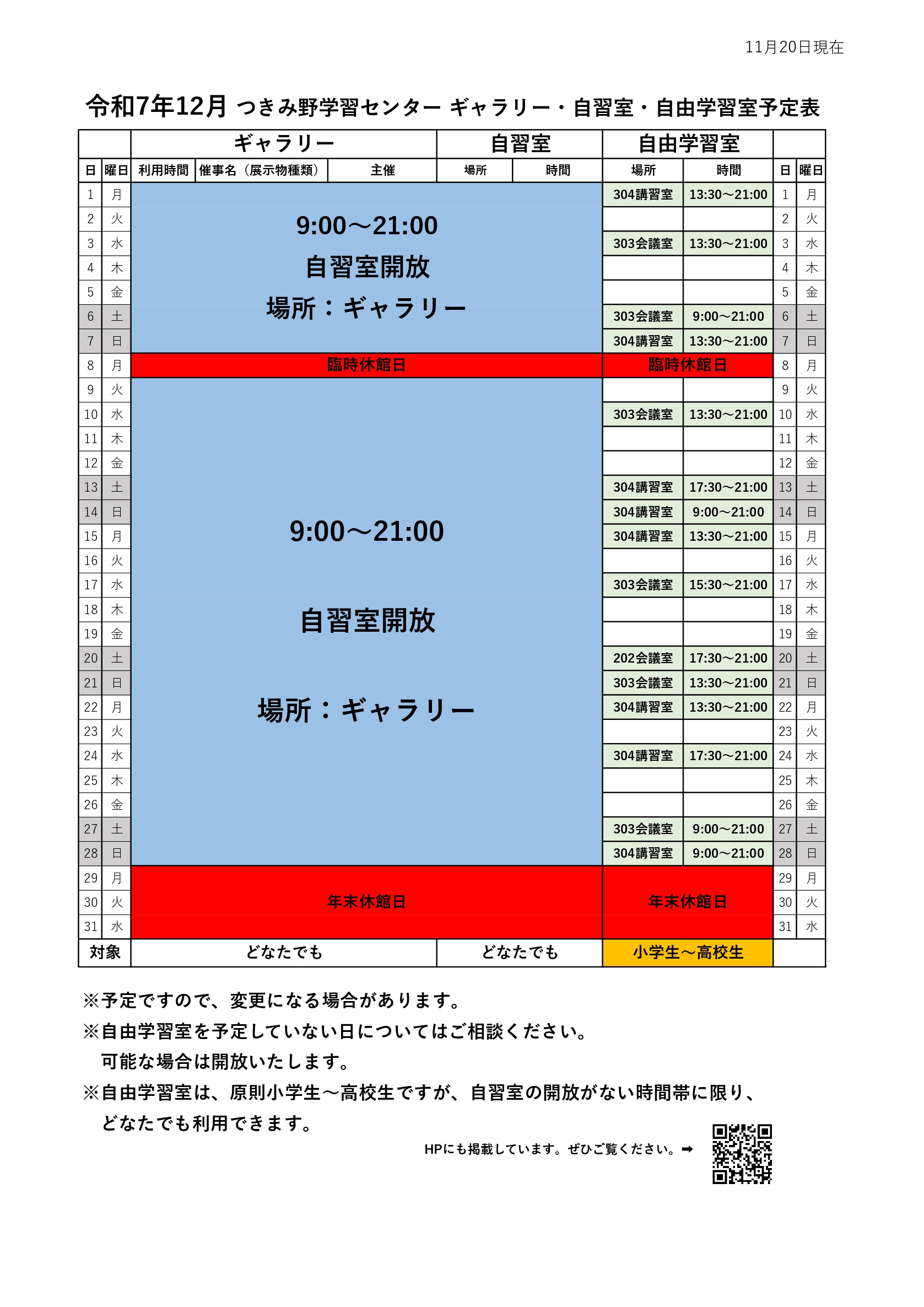 YAMATOMIRAI > つきみ野学習センター > イベント情報 > 令和7年12月 つきみ野学習センター ギャラリー・自習室・自由学習室予定表