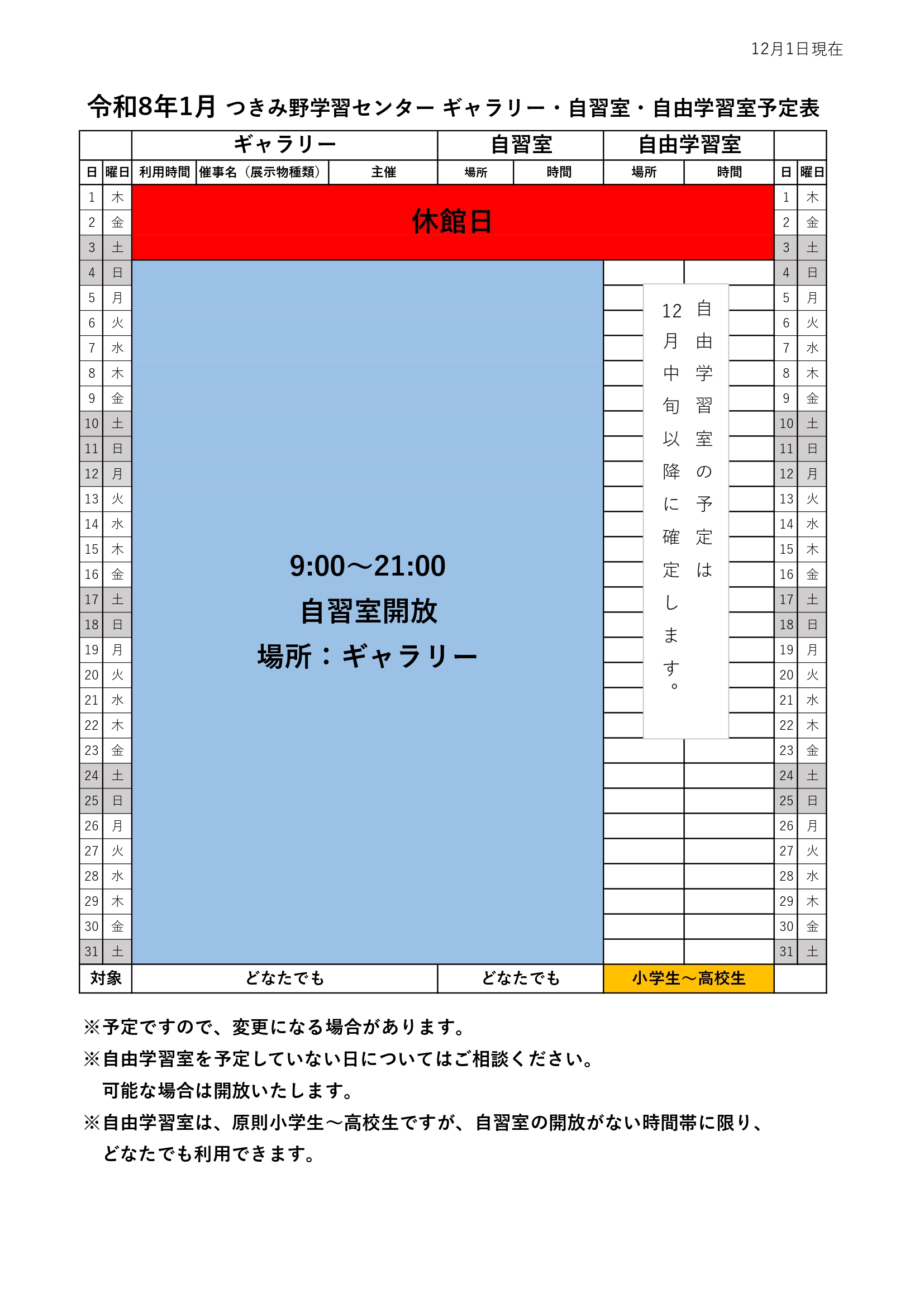 YAMATOMIRAI > つきみ野学習センター > イベント情報 > 令和8年1月 つきみ野学習センター ギャラリー・自習室・自由学習室予定表