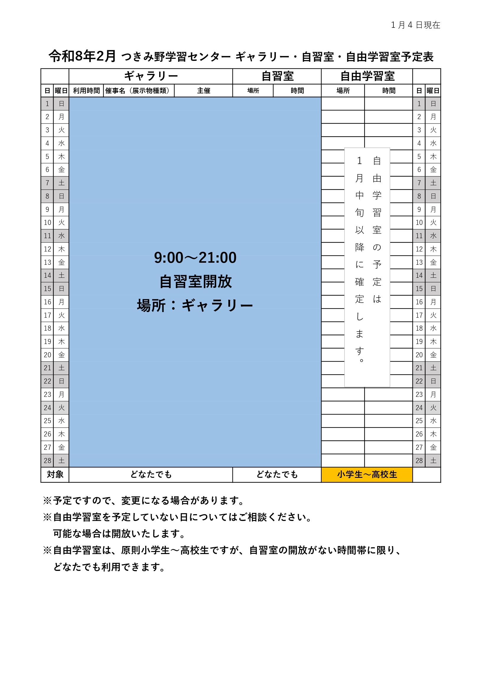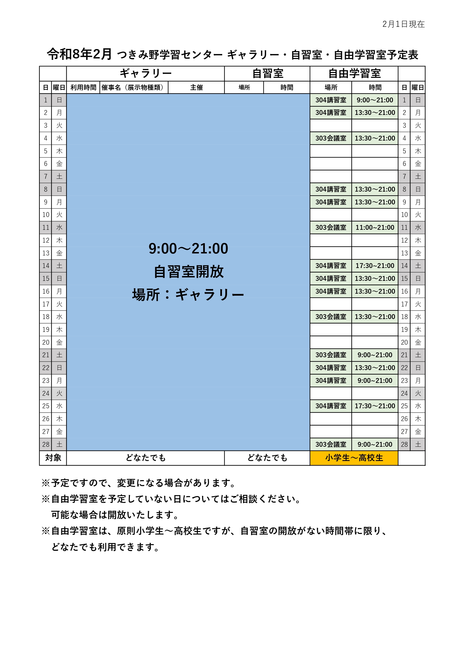 YAMATOMIRAI > つきみ野学習センター > イベント情報 > 令和8年2月 つきみ野学習センター ギャラリー・自習室・自由学習室予定表