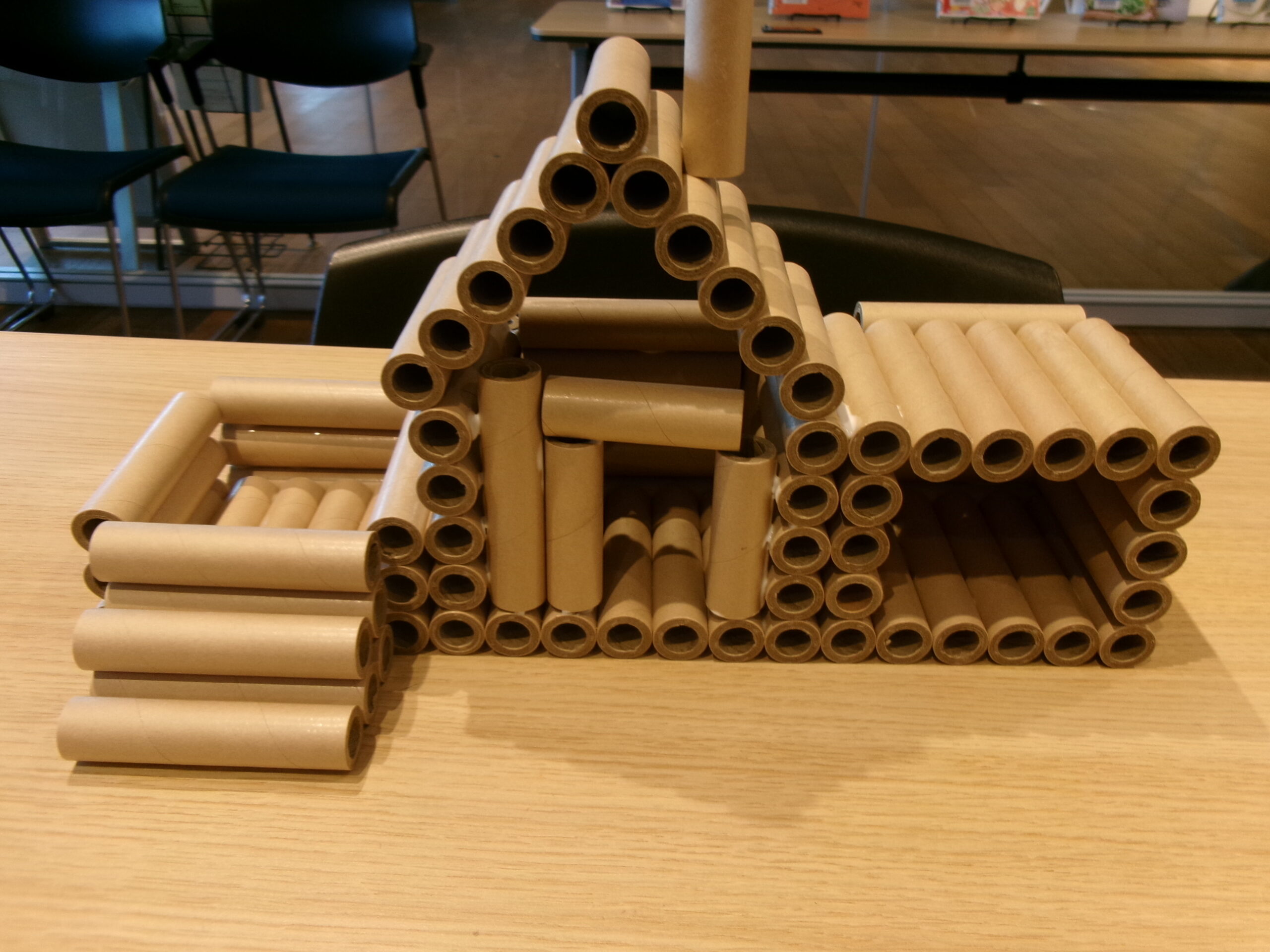 図書館で使われる検索機や貸出機で出るレシートの芯を使いお家を作りました。