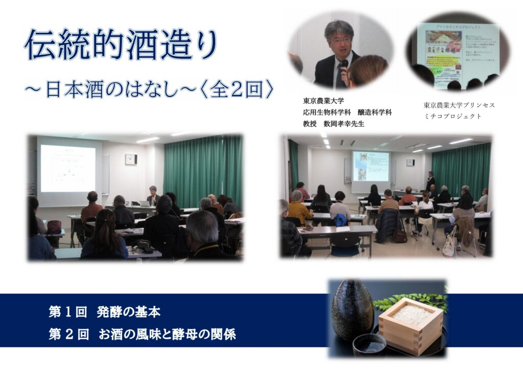 伝統的酒造りの、杜氏、蔵人等がこうじ菌を使い、長年の経験に基づき築き上げてきた酒造りの技術についてを、東京農業大学 応用生物科学部 醸造科学科 数岡孝幸教授にご講義いただきました。