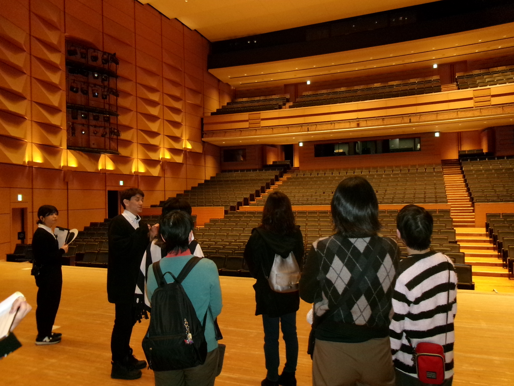 まずは1階のホールから。出演者の気分で舞台に立ちます!舞台袖では機器の説明に聞き入ります👂