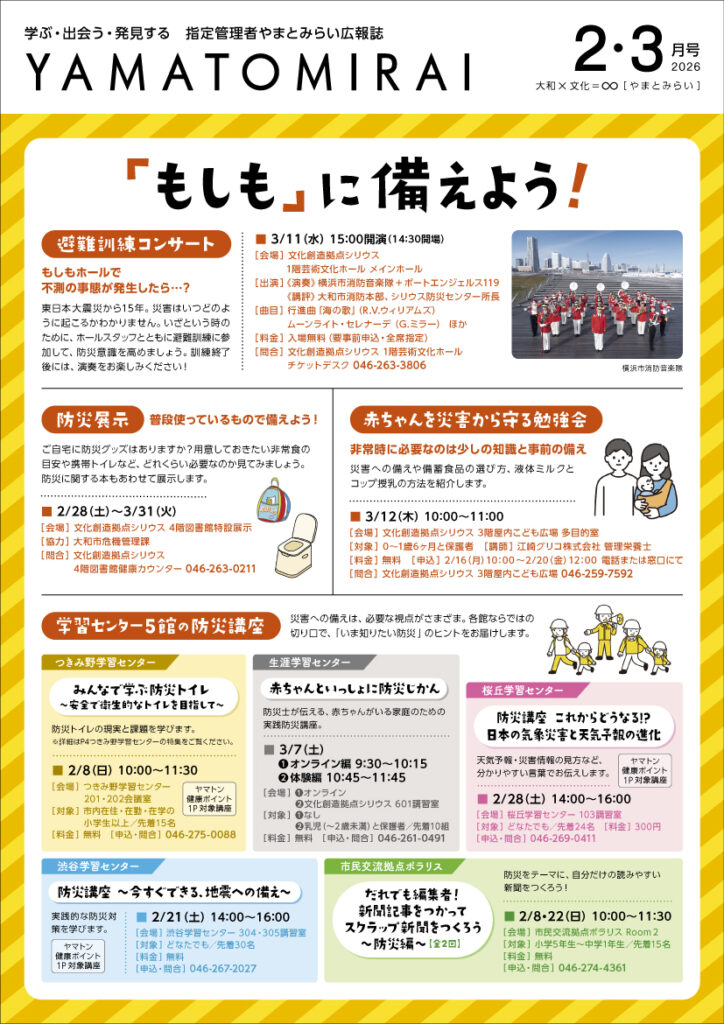 大和市内7施設の広報誌「YAMATOMIRAI(やまとみらい)」2・3月号を発行しました。市内新聞折込や公共施設等で配布していますので、ぜひご覧ください。画像をクリックすると読めます。↓